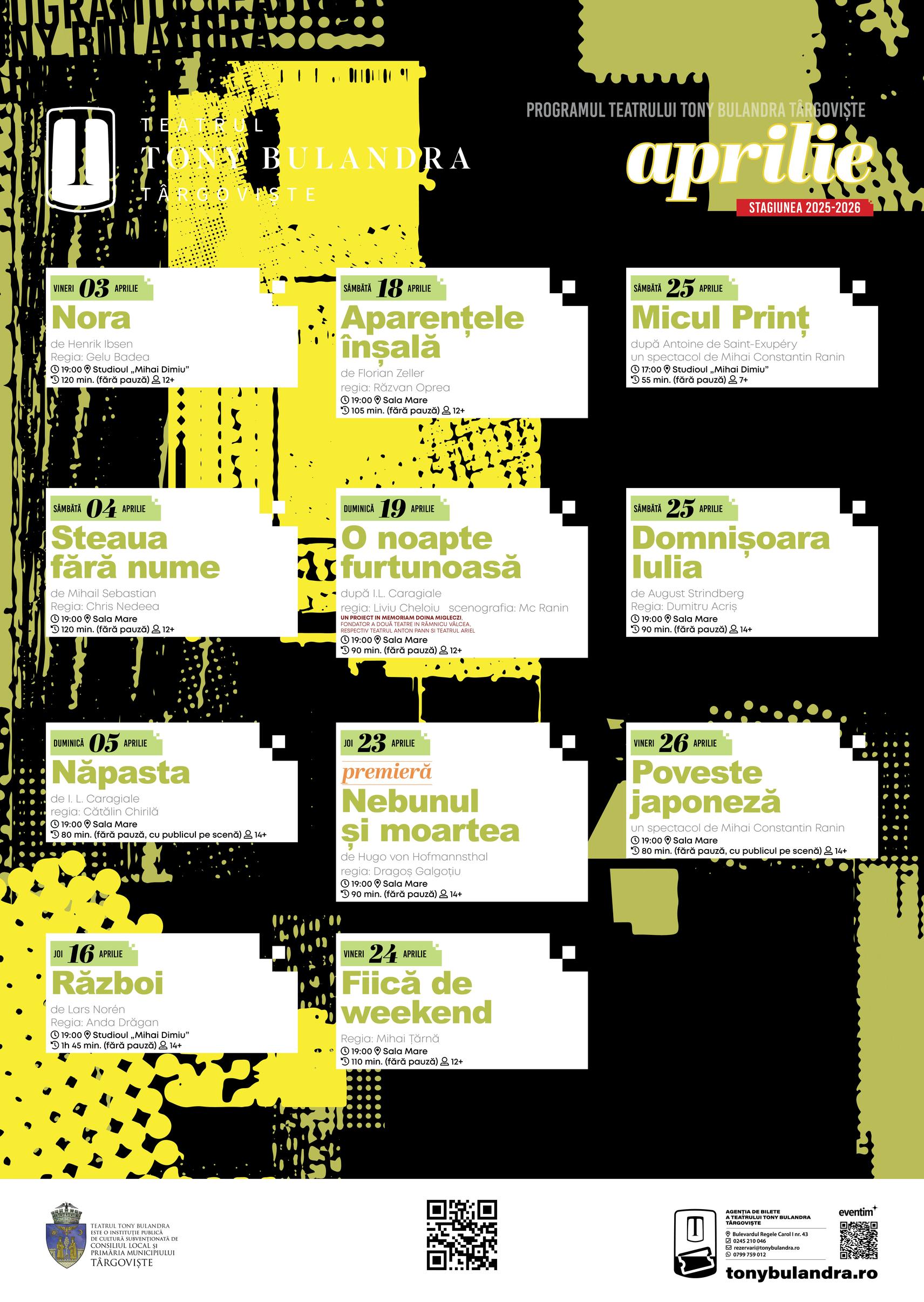 În luna aprilie, Teatrul Tony Bulandra din Târgoviște pune la dispoziția publicului o ofertă variată de spectacole, precum comedii de succes sau drame captivante, însă pregătește, totodată, și două premiere, respectiv „Nebunul și moartea” de Hugo von Hofmannsthal și “Anotimpurile” de Ana Maria Cucută Sandu.