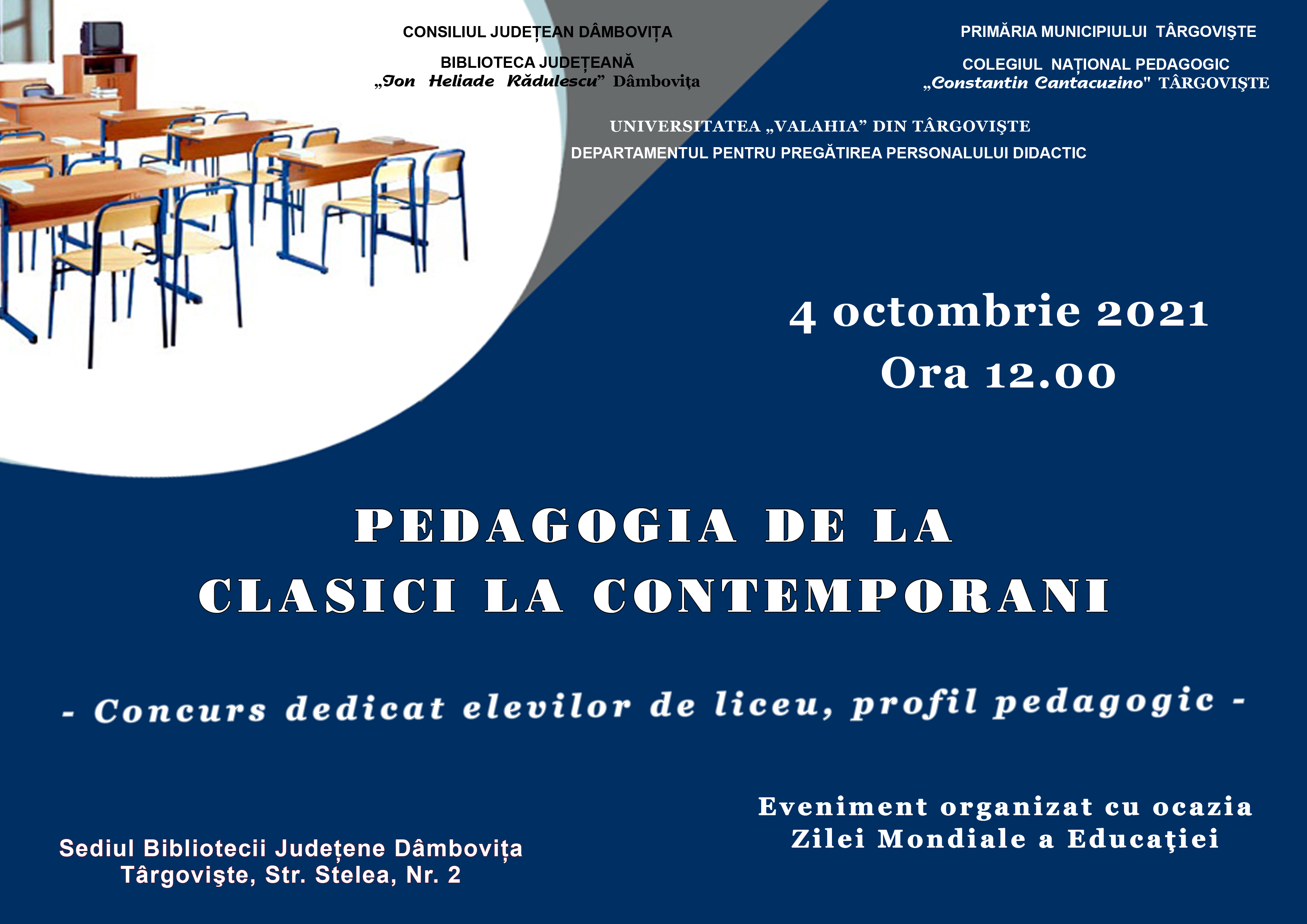 Luni, 4 octombrie 2021, orele 12.00, la sediul Bibliotecii Judeţene „I. H. Rădulescu” Dâmboviţa, se va desfăşura concursul de istorie a învăţământului dedicat elevilor de liceu, profil pedagogic: „Pedagogia – de la clasici la contemporani”.